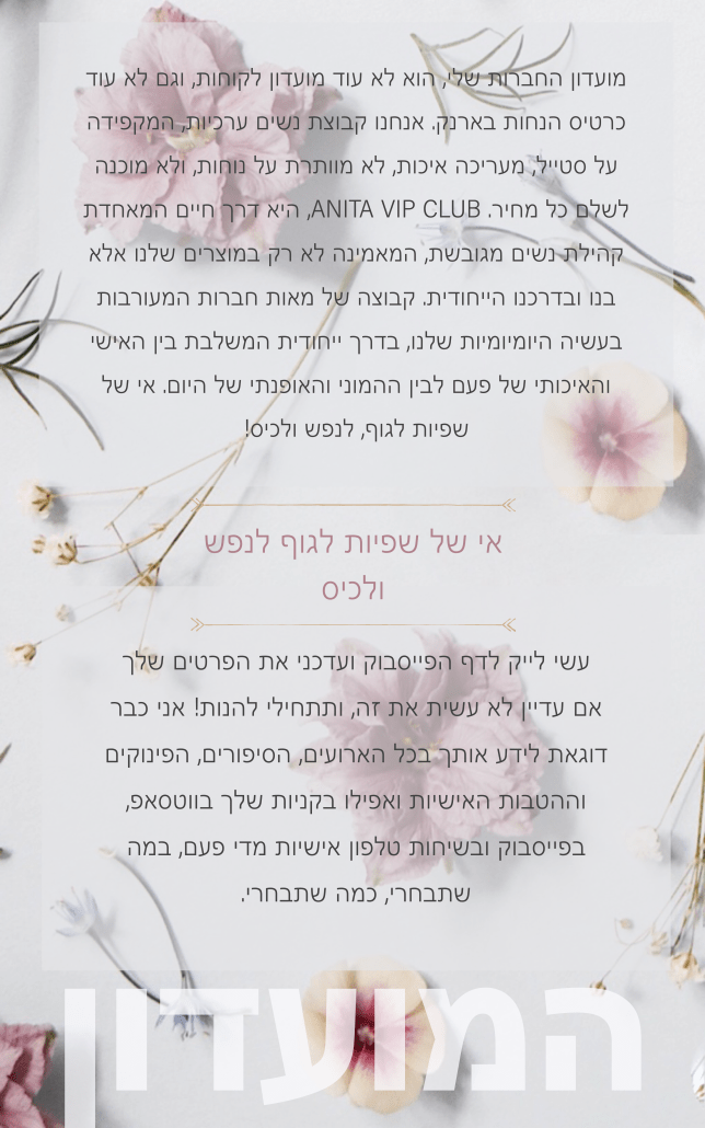 ברוכה הבאה. אני אניטה, מנהלת מזה כשני עשורים את אניטה, חנות בוטיק לנעלי נוחות מעוצבות, ומועדון חברות יחיד במינו ANITA VIP CLUB. אניטה היא לא רשת חנויות, לא אתר מסחר וגם לא רק חנות אונליין. לא חנות ככל החנויות ולא מועדון ככל המועדונים.