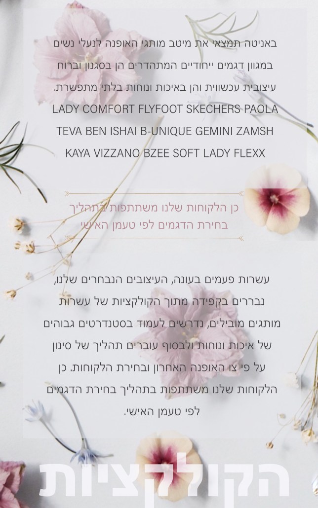 אניטה היא פינת חמד שכיף לבוא אליה כל פעם מחדש ולגלות בה את כל הטוב שאת לא מוצאת במקום אחר. חנות בוטיק חיננית, חמה, נינוחה ומקצועית לנעליים נוחות ומעוצבות. נעליים לכל מטרה והופעה, הנבחרות בעין חדה ובמומחיות ממיטב מותגי נוחות ומותאמות במקצועיות לכל אחת ואחת מכן בהמון אהבה.