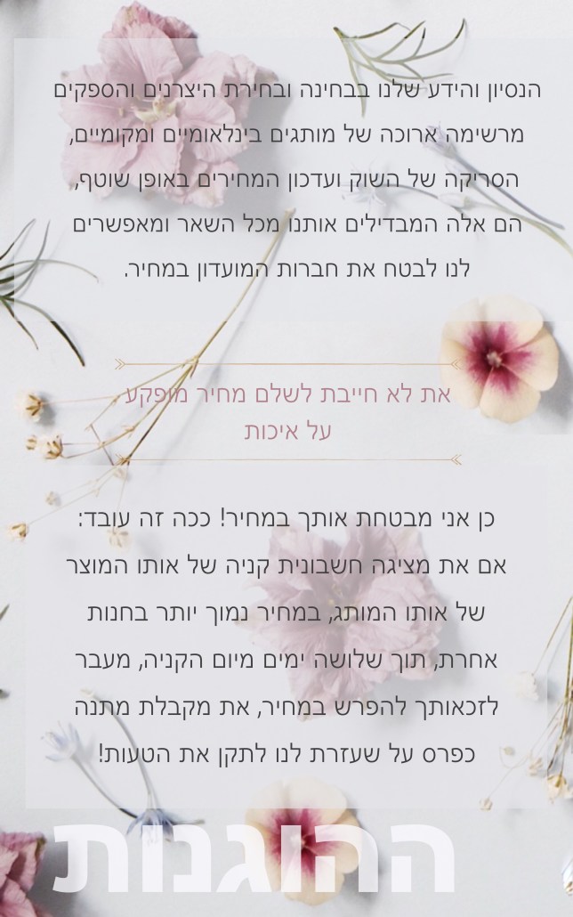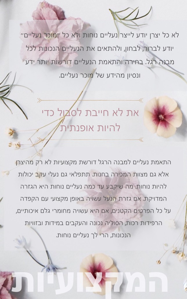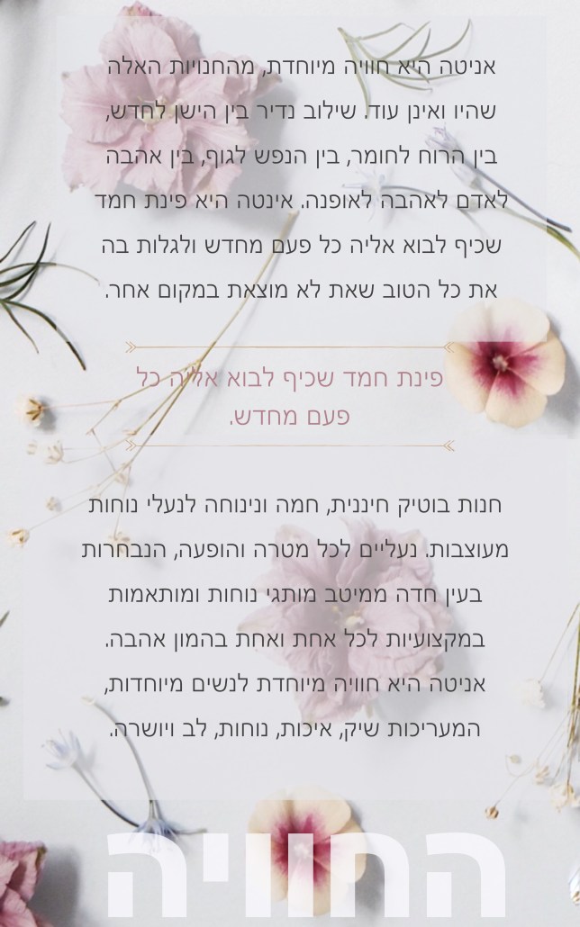 אם את מתגעגעת לחום, לאישי, למקצועי, לאיכותי בחנויות של פעם, אם את מקפידה על ההופעה שלך ורוח עיצובית עכשווית ולא מוכנה יותר להקריב את הנוחות שלך למען האופנתיות, אם מאסת במחירים מופקעים על מותגי איכות, הגעת לחוויה הנכונה.