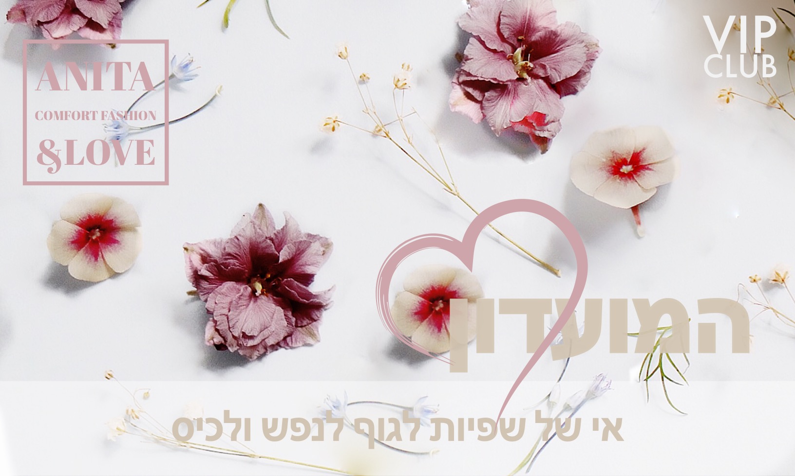 מועדון החברות שלי, הוא לא עוד מועדון לקוחות, וגם לא עוד כרטיס הנחות בארנק. אנחנו קבוצת נשים ערכיות, המקפידה על סטייל, מעריכה איכות, לא מוותרת על נוחות, ולא מוכנה לשלם כל מחיר. CLUB VIP ANITA, היא דרך חיים המאחדת קהילת נשים מגובשת, המאמינה לא רק במוצרים שלנו אלא בנו ובדרכנו הייחודית. קבוצה של מאות חברות מעורבות בעשיה היומיומיות שלנו, בדרך ייחודית המשלבת בין האישי והאיכותי של פעם לבין ההמוני והאופנתי של היום. אי של שפיות לגוף, לנפש ולכיס!